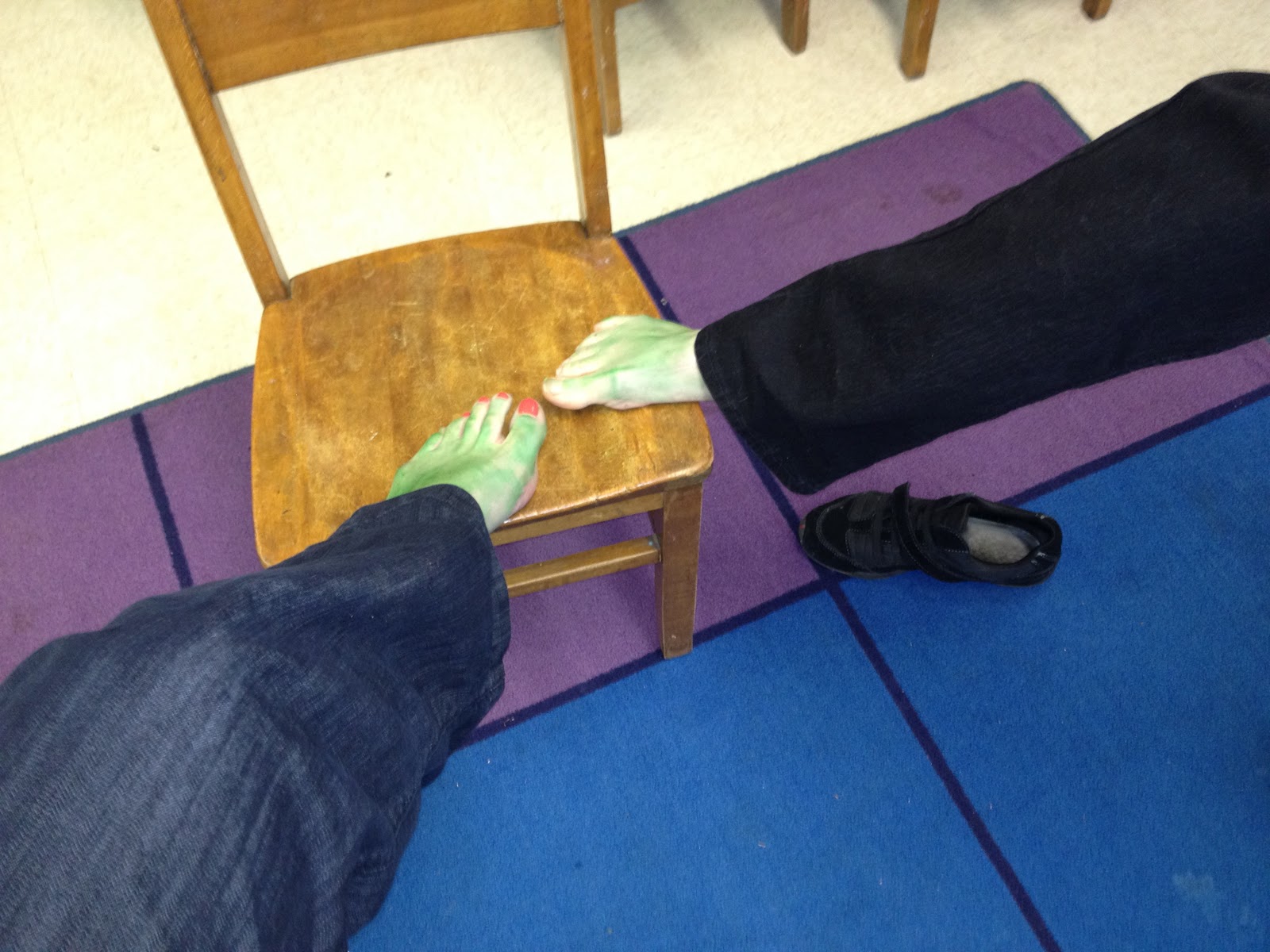 We were shocked and amazed to find that a leprechaun had been in our classroom on St. Patricks's Day. In addition to leaving a mess, Patrick O'Malley McGinnis left us a tiny note and a treat. The treat was a Magic Drink. Despite the warning on the label, my assistant and I drank the green drink (to chants of "drink it, drink it":) As the warning stated, our feet turned green!!! The kids were thrilled!